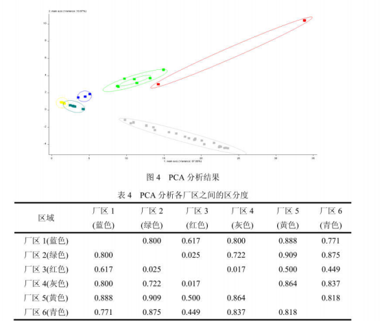 本文基于典型恶臭污染源样品的电子鼻分析和人工嗅辨结果,利用偏小二乘法(PLS)建立了电子鼻臭气浓度反演曲线,并结合主成分分析方法(PCA分析),初步建立了某工业区主要恶臭排放企业的特征指纹库。