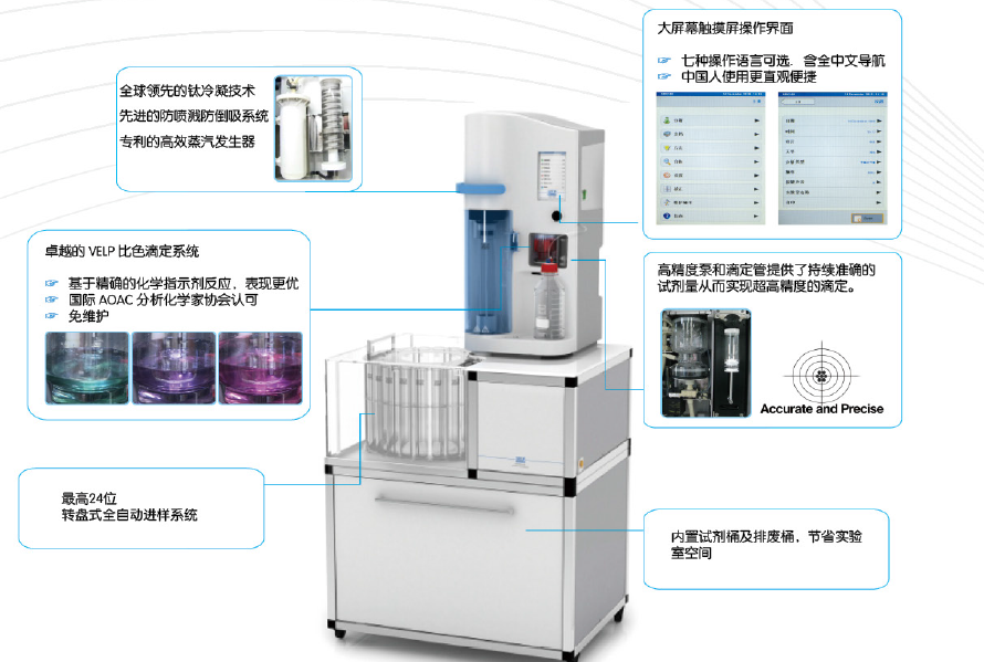 (1)程序化全自动控制完成自动进样、蒸馏滴定的全过程,包括试剂添加、蒸馏滴定过程控制、残渣排空、终结果计算及试验结果报告等,选定检测程序后试验过程一键式完成,几分钟内就可获得准确的结果。