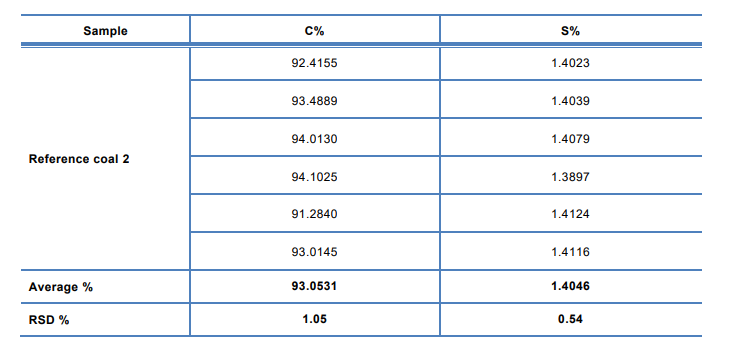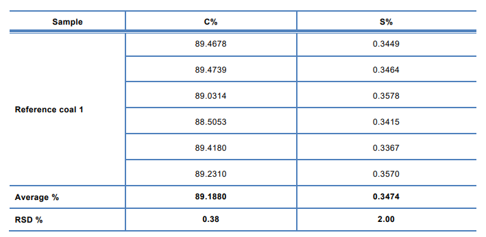 CHNS校准:CHNS结果已得到校准曲线使用认证标准AR4019 (C% = 0.11 - S%= 0.11),使用范围为15-50 mg的AR4019。获得的数据包括在碳和硫含量分析证书(声明参数)承认的公差内。下表显示了使用5- 6mg样品用EMASoftTM得到的%C, %S。EMA 502 CHNS-O元素分析仪是测定煤样中碳、硫的可靠方法,可用于评价煤样质量。